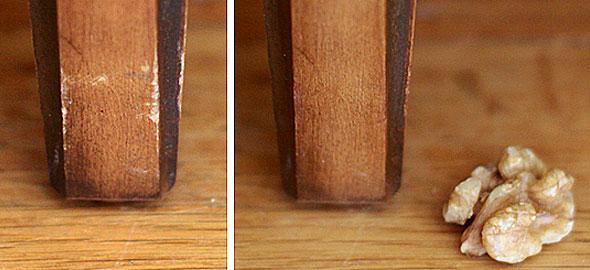 Αν έχετε ξύλινα έπιπλα, ενδεχομένως να σας εκνευρίζουν οι γρατζουνιές που χαλάνε την ομορφιά τους. Και όμως, δεν χρειάζεστε ούτε μπογιά ούτε άλλα ειδικά χημικά για να τις καλύψετε –τα καρύδια θα κάνουν την ίδια δουλειά. Απλώς τρίψτε απαλά το καρύδι στην επίμαχη περιοχή και θα δείτε ότι οι αποχρωματισμοί θα εξαφανιστούν μαγικά μέσα σε δευτερόλεπτα!