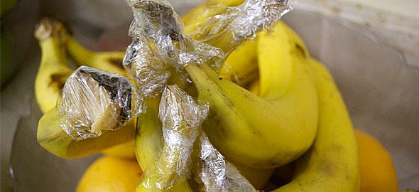 Θα έχετε παρατηρήσει ότι οι μπανάνες αρχίζουν να μαυρίζουν πολύ εύκολα με αποτέλεσμα μέσα σε λίγες μέρες να χαλάνε εντελώς. Για ν’ αποτρέψετε το κακό να συμβεί, καλύψτε το κοτσάνι της κάθε μίας με μία πλαστική μεμβράνη και στη συνέχεια βάλτε τις σε μία πλαστική σακούλα στο ψυγείο.
