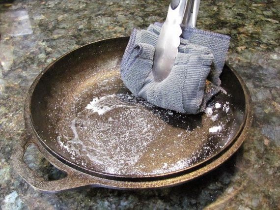 2. Για τα καμένα λίπη που μένουν το τηγάνι, ρίξτε λίγο αλάτι μόλις απομακρύνετε το φαγητό από το σκεύος, το οποίο θα διασπάσει τα λίπη και θα βοηθήσει στην εύκολη απομάκρυνσή τους.