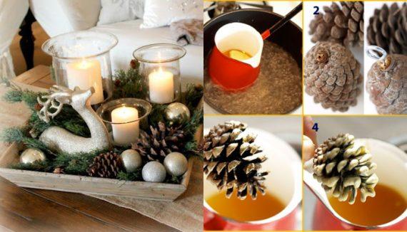 Αφού προετοιμάσουμε τα κουκουνάρια αποφασίζουμε πώς θα τα στολίσουμε και πώς θα τα χρησιμοποιήσουμε. Εάν θέλουμε να τα κρεμάσουμε, θα πρέπει προηγουμένως να βιδώσουμε στην κορυφή τους ένα μικρό κρικάκι.