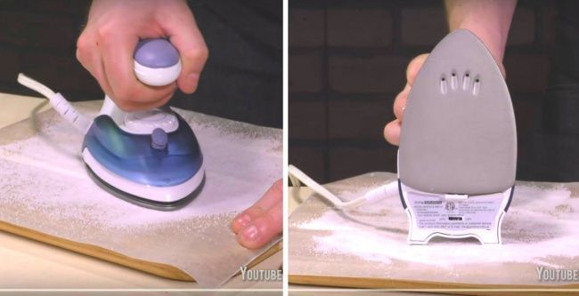 Πάρτε μια ξύλινη σανίδα κοπής, απλώστε επάνω μια λαδόκολλα και πασπαλίστε γενναιόδωρα με αλάτι. Αφήστε το σίδερο να ζεσταθεί και στη συνέχεια τρίψτε το επάνω στο αλάτι.Τα άλατα θα εξαφανιστούν στο λεπτό.