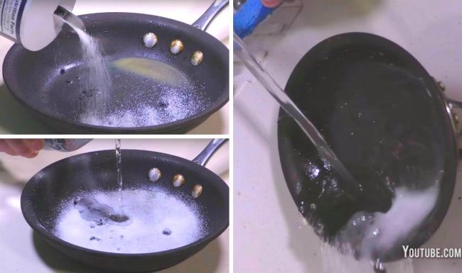 Γεμίστε τον πάτο του σκεύους με νερό, προσθέστε 1 φλιτζάνι ξίδι και αφήστε να πάρει βράση. Κατεβάστε από τη φωτιά και προσθέστε τη σόδα.Πλύνετε με σαπούνι για τα πιάτα. Εάν η βρωμιά παραμένει, σκουπίστε απαλά την επιφάνεια του σκεύους με σόδα.Άλλος ένας τρόπος είναι να καλύψετε τον πάτο του τηγανιού με αλάτι,προσθέσετε λίγο νερό και αφήστε το για 10 λεπτά.
