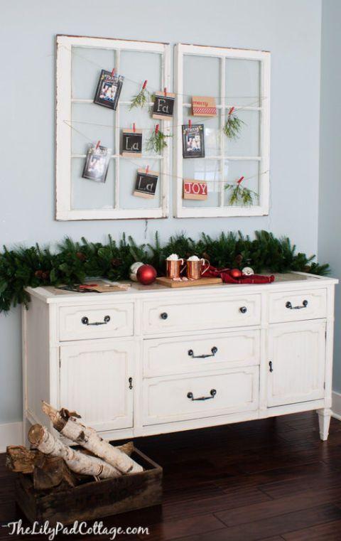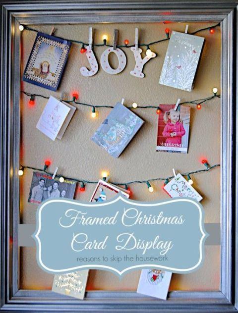 18. Χρησιμοποιήστε μια παλιά άδεια κορνίζα και διακοσμήστε τη με φωτάκια και χριστουγεννιάτικες κάρτες