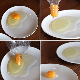 Για να ξεχωρίσετε το ασπράδι από το κρόκο, τοποθετήστε το στόμιο του μπουκαλιού ακριβώς πάνω από τον κρόκο και πιέστε ελαφρά. Ο κρόκος θα απομονωθεί στο μπουκάλι.