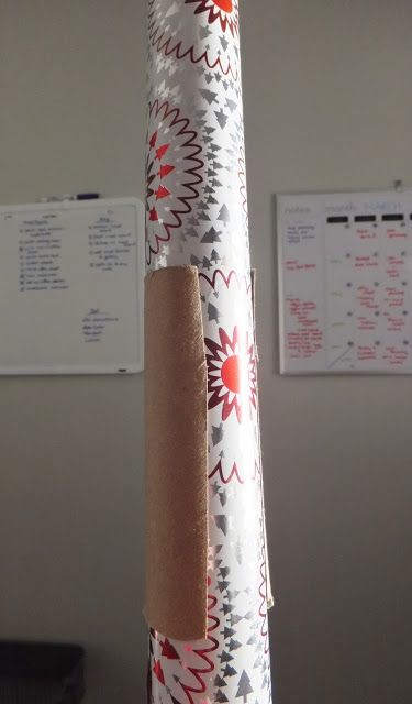 Για να κρατήσετε τα χαρτιά περιτυλίγματος στη θέση τους, πάρτε ένα χαρτόνι από χαρτί υγείας και κόψτε κατά μήκος ένα κομμάτι και στερεώστε το στο χαρτί περιτυλίγματος.