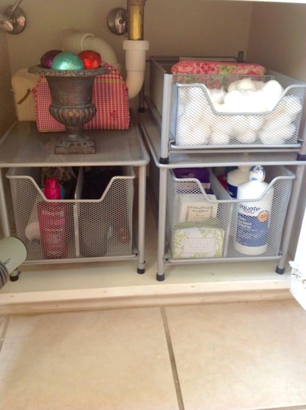 11. Βάλτε μία ράγα στο ντουλάπι κάτω από τον νιπτήρα για να κρεμάτε τα μπουκάλια σπρέι και τα σφουγγάρια σας