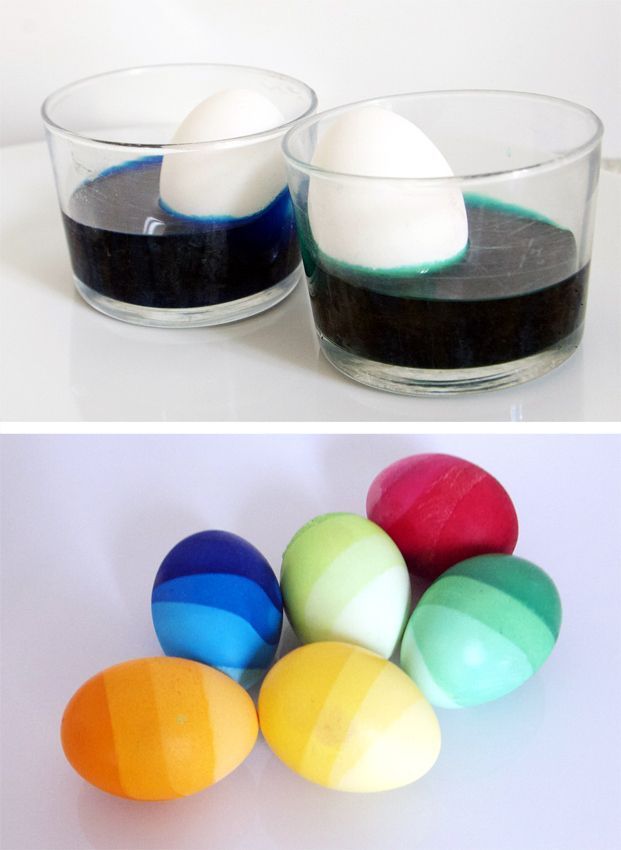 Τοποθετήστε τα αυγά σε ένα ποτήρι με λίγο νερό και χρώμα.Αφήστε για λίγα λεπτά και μετά προσθέστε λίγο ακόμα νερό και ξαναπεριμένετε.Επαναλάβετε την διαδικασία μέχρι να καλυφθούν τα αυγά από το νερό.