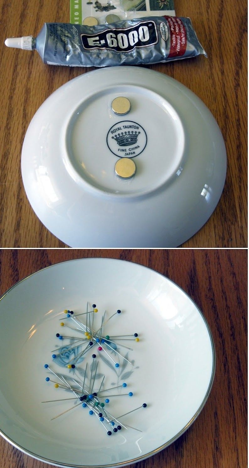 Προσθέστε μαγνήτες στο πίσω μέρος ενός πιάτου και χρησιμοποιήστε το για να κρατήσετε σε μια μεριά τις καρφίτσες κατά το ράψιμο σας. Με αυτόν τον τρόπο μπορείτε να αποτρέψετε την πτώση τους στο πάτωμα.