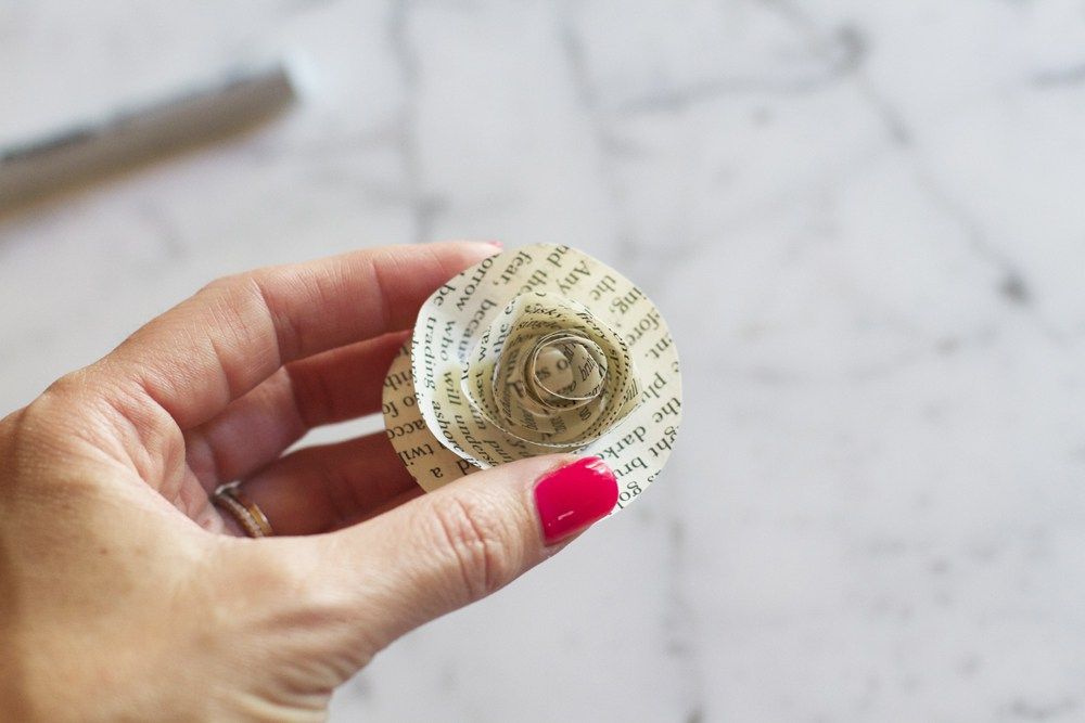Χρησιμοποιήστε ένα κοφτερό λεπίδι για να σκίσετε τις σελίδες του βιβλίου ομοιόμορφα.Σχεδιάστε στο χαρτί ένα σχέδιο σπείρα με τον μαρκαδόρο ή το μολύβι.Τα ανθάκια μας δεν χρειάζεται να έχουν όλα το ίδιο μέγεθος.
