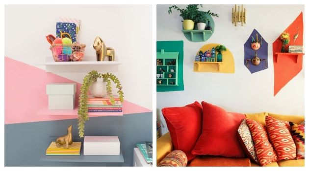4. Τοποθετείστε στον τοίχο μικρά ράφια βαμμένα σε έντονες αποχρώσεις και περιμετρικά στο κάθε ένα “ζωγραφίστε” ένα σχήμα που θα γεμίσετε με το ίδιο χρώμα.
