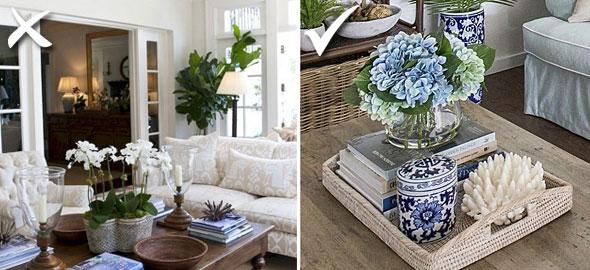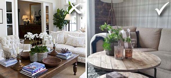 Όλοι θέλουμε να έχουμε τα αγαπημένα μας αντικείμενα σε κοινή θέα, όμως, τα πολλά διακοσμητικά «πνίγουν» τον χώρο και κάνουν το δωμάτιο να φαίνεται πιο μικρό. Τα πολλά κάδρα και κορνίζες, τα κεράκια και τα κηροπήγια και τα γυάλινα τασάκια-καπνίζετε δεν καπνίζετε- χαλούν την αισθητική του σαλονιού, γι’αυτό μετριάστε τα.
