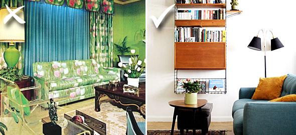 Μπορεί τα vintage και τα ρετρό κομμάτια να ξαναγύρισαν στην μόδα, όμως χρειάζεται ένα μέτρο. Διαφορετικά μπορεί να κάνουν το σαλόνι να φαίνεται πολύ κακόγουστο. Υπάρχει τεράστια «αισθητική» απόσταση μεταξύ ενός πικάπ και μιας λάμπας-λάβας. Όπως και επίσης ανάμεσα και στο σεμεδάκι της γιαγιάς και ένα ριχτάρι ή ένα boho χαλί.