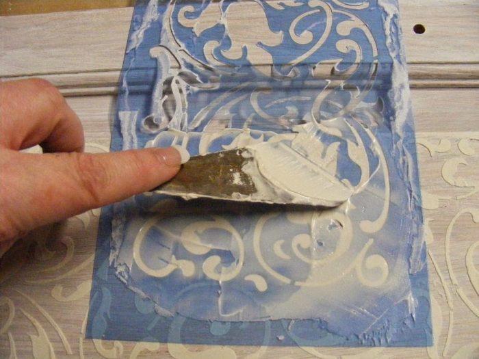 Διαλέξτε ένα σχέδιο stencil, από την ποικιλία που θα βρείτε τόσο σε καταστήματα με είδη χόμπυ-κατασκευών αλλά και μεγάλα χρωματοπωλεία – καταστήματα με είδη σπιτιού, όπως και σε ποιαχρώματα θέλετε να αποτυπωθεί το σχέδιο και εφαρμόστε-στερεώστε το stencil στο πορτάκι μεκολλητική ταινία.