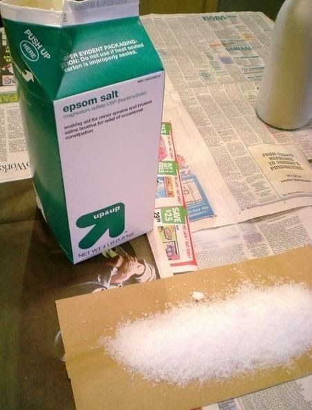 Θα χρειαστείτε αλάτι (η αλατα πλυντηριου), λευκό χρώμα, εφημερίδα και ένα γυάλινο μπουκάλι.