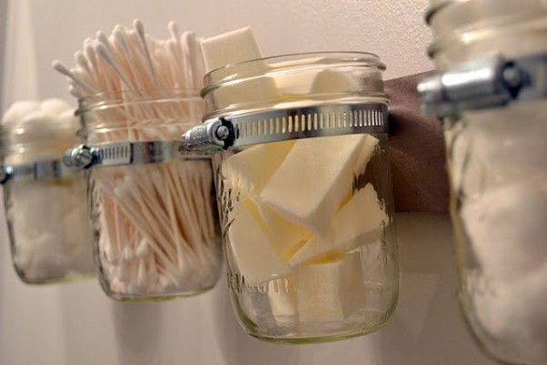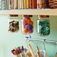 - Βαμμένα βάζα που χρησιμοποιούνται ως μολυβοθήκες προτείνει το kootutmurut.com // 2. Μια πολύ χρήσιμη ιδέα είναι το να μετατρέψεις ένα βαζάκι σε ένα kit ραπτικής! τις οδηγίες θα τις βρεις εδώ. // 3. & 4. & 5. Βάψε τα καπάκια τους με μαυροπίνακα ώστε να σημειώνεις με κιμωλία το τι περιέχουν, κόλλησέ τα στο τοίχο, ή άνοιξέ τους μια τρύπα στο καπάκι ώστε να μπορείς να τοποθετείς τα κουβάρια σου χωρίς να μπλέκονται! Αυτές αλλά και άλλες έξυπνες ιδέες, μπορείς να τις δεις στο home and simple. // 6. Αν τα βάζα δε χωράνε στο ντουλάπι, βίδωσέ τα στο κάτω μέρος ενός ραφιού! Έτσι θα μπορείς να βρεις πιο γρήγορα αυτό που ψάχνεις και θα είναι πολύ πιο εύχρηστα. Η εικόνα είναι από εδώ.