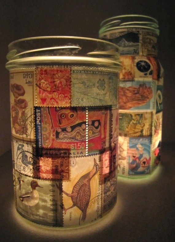 Άλλος ένας απλός, retro τρόπος, είναι να κολλήσεις γραμματόσημα (στο εξωτερικό) του βάζου, και στη συνέχεια να το χρησιμοποιήσεις σαν μολυβοθήκη, αποθηκευτικό χώρο, βάζο, θήκη για κερί ή ότι άλλος μπορείς να φανταστείς. Η ιδέα είναι από το LuniqueUK’s Shop.