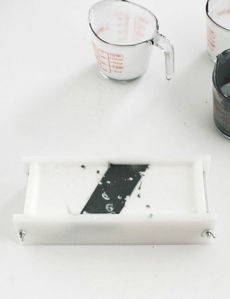 Βήμα 4ο: Βάλτε στο ορθογώνιο δοχείο τα 2 διαχωριστικά και ρίξτε στα δύο ακριανά μέρη λευκό σαπούνι και στο μεσαίο τη μπογιά.