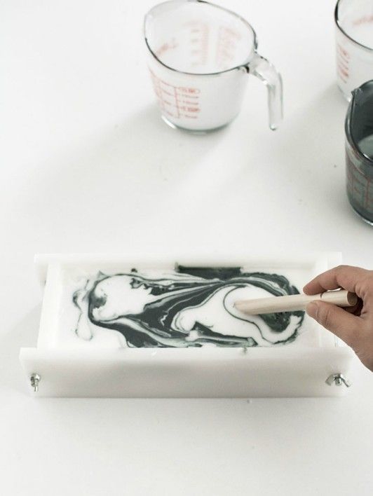 Βήμα 5ο: Αφαιρέστε τα διαχωριστικά και σιγά σιγά με το ξυλάκι ανακατέψτε ελαφρώς το λευκό με το ανθρακί χρώμα για να δημιουργηθεί το εφέ του μαρμάρου.