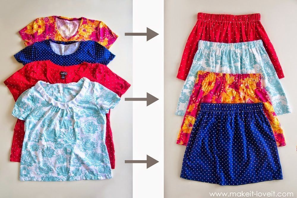 Επαναχρησιμοποιήστε παλιά μπλουζάκια και φτιάξτε φούστες μέσα σε 10 λεπτά . Ο λόγος που είναι τόσο γρήγορο να γίνει ; Λοιπόν , αγοράστε 4 μπλουζάκια είτε από το τμήμα προσφορών είτε από κατάστημα με μεταχειρισμένα ρούχα είτε από φιλανθρωπική αγορά , διατήρηστε το αρχικό στρίφωμα και τις πλαϊνές ραφές και απλά προσθέστε ένα λάστιχο . Και κοστίζει πολύ φθηνότερα από ό, τι μια φούστα ! Για ακόμη μικρότερο κόστος ψάξτε στις ντουλάπες σας και σίγουρα θα βρείτε κάποιο μπλουζάκι που δε φοράτε πια !