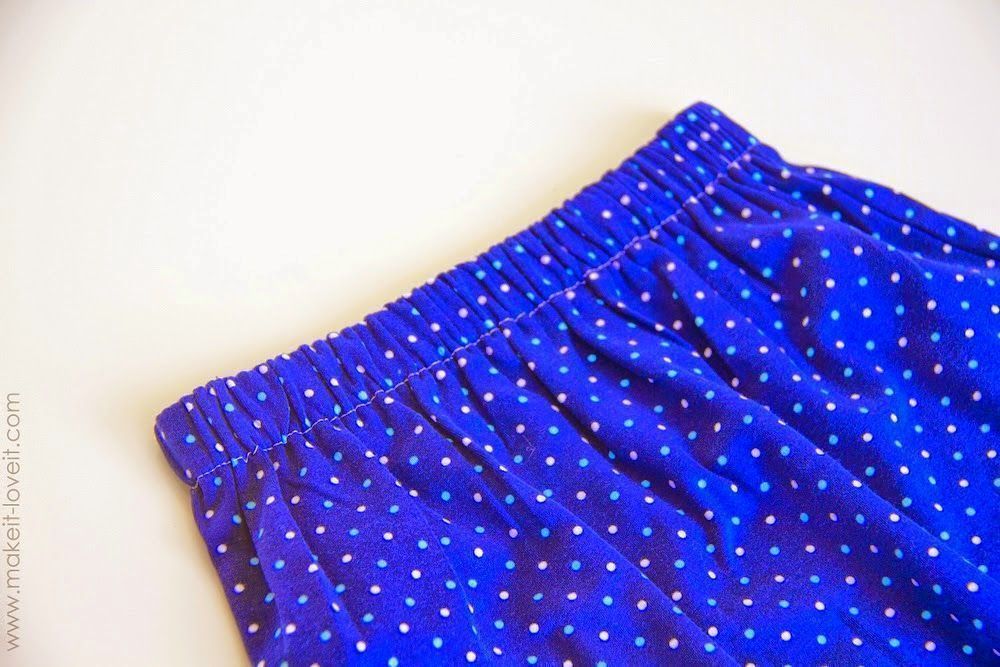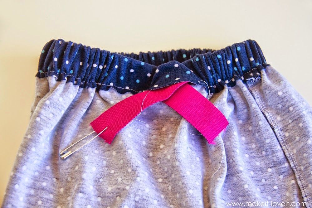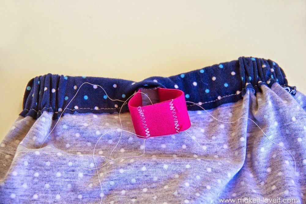 Κόψτε ένα κομμάτι λάστιχο στο ίδιο μήκος με τη μέση που ράψατε . Βάλτε το χρησιμοποιώντας μια παραμάνα στο ένα άκρο και περάστε το μέσα από το στρίφωμα που κάνατε στο τελευταίο βήμα .