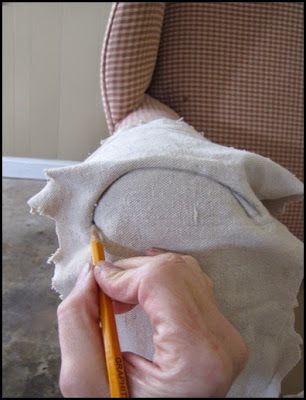 Τοποθετείτε ένα κομμάτι υφάσματος πάνω στο αντίστοιχο σημείο του επίπλου, το καρφιτσώνετε σε κάποια σημεία ώστε να είναι εντελώς τεντωμένο και με ένα μολύβι “σχεδιάζετε” πάνω στο ύφασμα από την ανάποδη πλευρά το περίγραμμα-σχήμα του κομματιού.