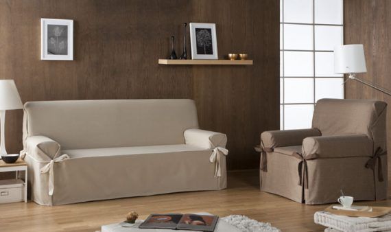 Μια ενδιάμεση, επίσης, μορφή καλυμμάτων σε σχέση με τα κανονικά κι ένα ριχτάρι, είναι εκείνα που μπορείτε να φτιάξετε χρησιμοποιώντας ένα μεγάλο κομμάτι υφάσματος-ριχτάρι που θα καλύπτει ολόκληρο το έπιπλο και απλώς σε ορισμένα σημεία π.χ μπροστά, στο πλάϊ κλπ. με “πρόχειρους” και εύκολους τρόπους θα σταθεροποιήσετε και θα δημιουργήσετε ένα σχέδιο π.χ με δυο πρόσθετα κορδονάκια που θα δένουν και θα δημιουργούν “πιέτες” στα μπράτσα κλπ.