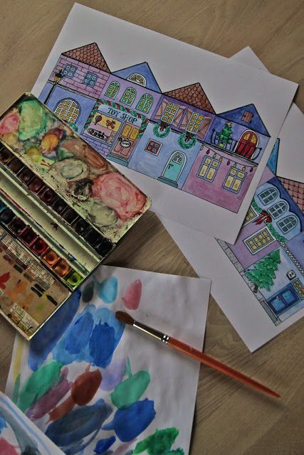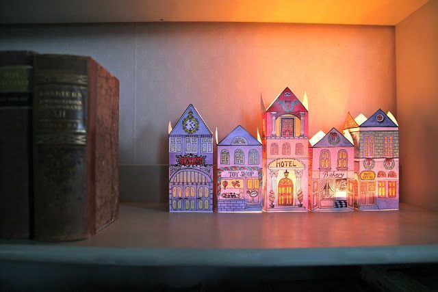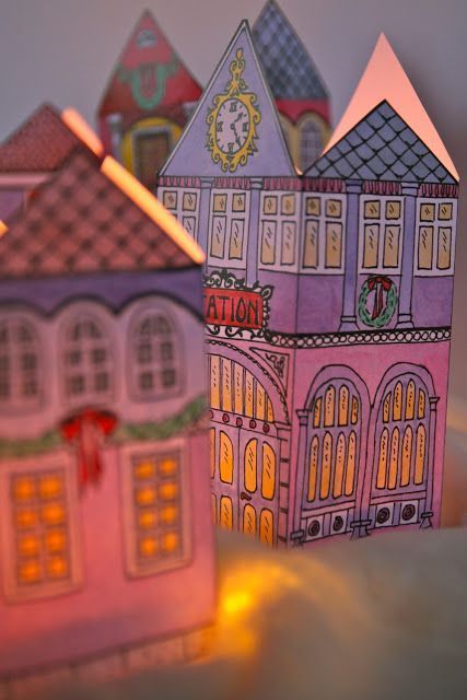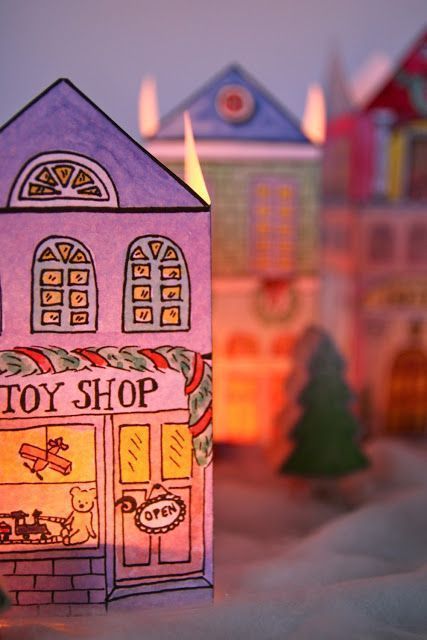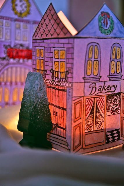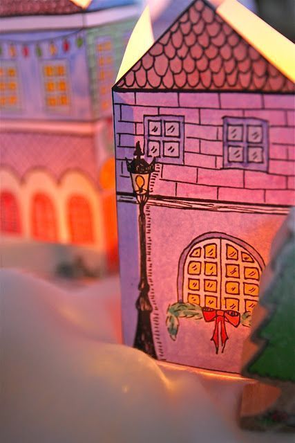 Πόσο όμορφο φαίνεται τα Χριστούγεννα ένα φωτιζόμενο Χριστουγεννιάτικο χωριό σε όποια γωνιά του σπιτιού κι αν το στολίσουμε! Η κατασκευή του πραγματικά είναι εύκολη αρκεί να υπάρχει φαντασία και υπομονή. Η διαδικασία είναι η εξής: Εκτυπώνεται σε ένα χαρτί το περίγραμμα (εδώ έχει χρησιμοποιηθεί χαρτί 160 γρ.) και το περνάτε με ένα χοντρό μαρκαδόρο και μετά ζωγραφίστε με νερομπογιές ή χρώματα ακουαρέλας. Μπορείτε να φτιάξετε μια γειτονιά με φούρνους και διάφορα μαγαζάκια. Το επόμενο βήμα είναι να τα τσακίσετε και να κολλήσετε το πίσω μέρος δημιουργώντας τρισδιάστατα κτήρια. Μπορείτε να τα φωτίσετε με λαμπάκια και το χριστουγεννιάτικο φωτιζόμενο χωριό σας είναι έτοιμο! (Προσέξτε τα λαμπάκια τι προελεύσεως είναι για να μην έχετε ατυχήματα. Διαβάστε ΕΔΩ για ασφαλή στολιδμο του σπιτιού τα Χριστούγεννα από το ΚΕΠΚΑ )