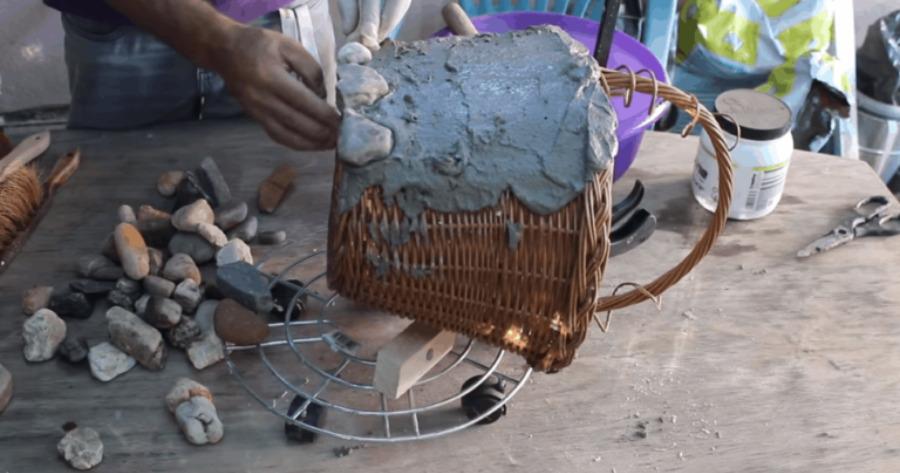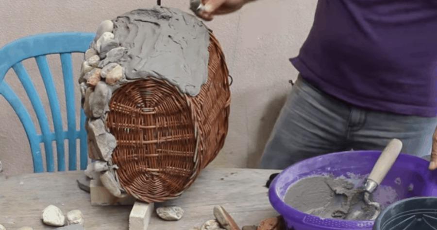 Τα καλάθια είναι μια καλή επιλογή. Για τη συγκεκριμένη κατασκευή θα χρειαστείτε ένα ψάθινο καλάθι, τσιμεντοκονίαμα ή κόλλα πλακιδίων και πέτρες της επιλογής σας. Μπορείτε να χρησιμοποιήσετε, βότσαλα, χαλίκι, θρυμματισμένη πέτρα ή οτιδήποτε άλλο θέλετε.