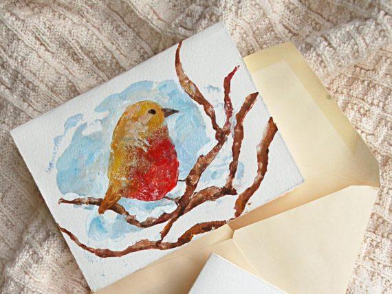 Για να κάνετε την κάρτα με το πουλί θα χρειαστεί να δημιουργήσετε περισσότερες στάμπες από οτι για την κάρτα του χιονάνθρωπου αλλά η διαδικασία πάνω κάτω είναι ίδια. Για να κάνετε λοιπόν την κάρτα πουλιού θα χρειαστείτε δύο πατάτες κομμένες στη μέση, κόκκινο, καφέ, κίτρινο, μπλε και λευκό ακρυλικό χρώμα, ένα πινέλο και κενές κάρτες.