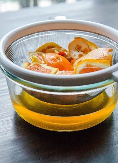 Δύο εβδομάδες μετά στραγγίξτε το μείγμα πάνω από ένα μεγάλο μπολ, χρησιμοποιώντας το σουρωτήρι, έτσι ώστε να απομείνει μόνο το υγρό αρωματισμένο ξύδι και πετάξτε τις φλούδες.