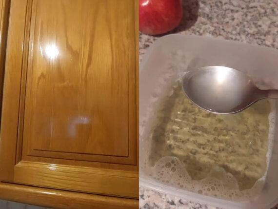 Ένα έξυπνο κόλπο από το TikTok με πράσινο σαπούνι και ελαιόλαδο μας δείχνει πως μπορούμε να γυαλίσουμε τα παλιά και θαμπά ντουλάπια της κουζίνας αλλά και άλλα ξύλινα έπιπλα σαν επιπλοποιός.