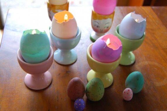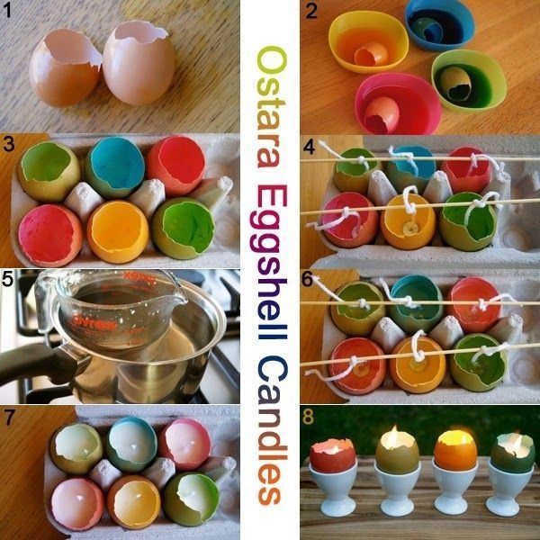 Σπάτε προσεκτικά το επάνω μέρος του αυγού όπως ακριβώς δείχνει και η φωτογραφία και αδειάζετε το περιεχόμενό του σε ένα μπολ. Τα αφηνετε ολη νυχτα σε ενα μπολακι με νερό και ξυδι για να μην μυρίζει αυγουλίλα. Στη συνεχεια αν θελετε τα βαφετε αν δε θελετε ειναι ομορφα και λευκα. Λιώνετε τα τρίμματα των κεριών και γεμίζετε τα τσόφλια μέχρι σχεδόν το χείλος τους. Κόβετε ένα κομμάτι από το φυτίλι και το τοποθετείτε στο κέντρο τυλίγοντας το πάνω μέρος σε ένα ξυλάκι για να σταθεί εκεί που θέλετε. Αφήνετε το αβγό κερί μέσα σε μια αυγοθήκη μέχρι να κρυώσει και να πήξει το κερί.