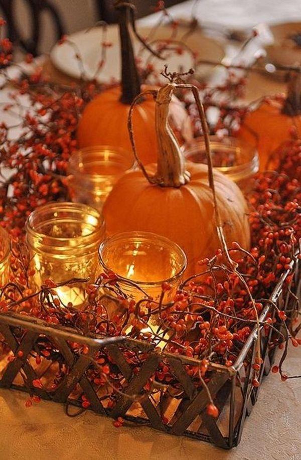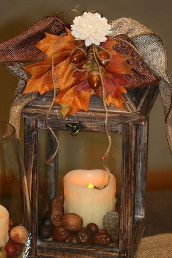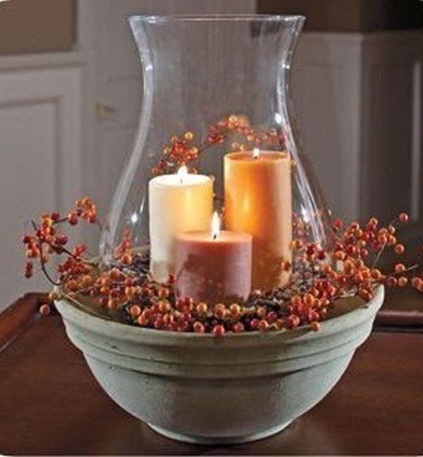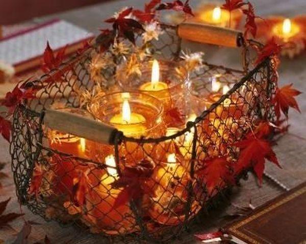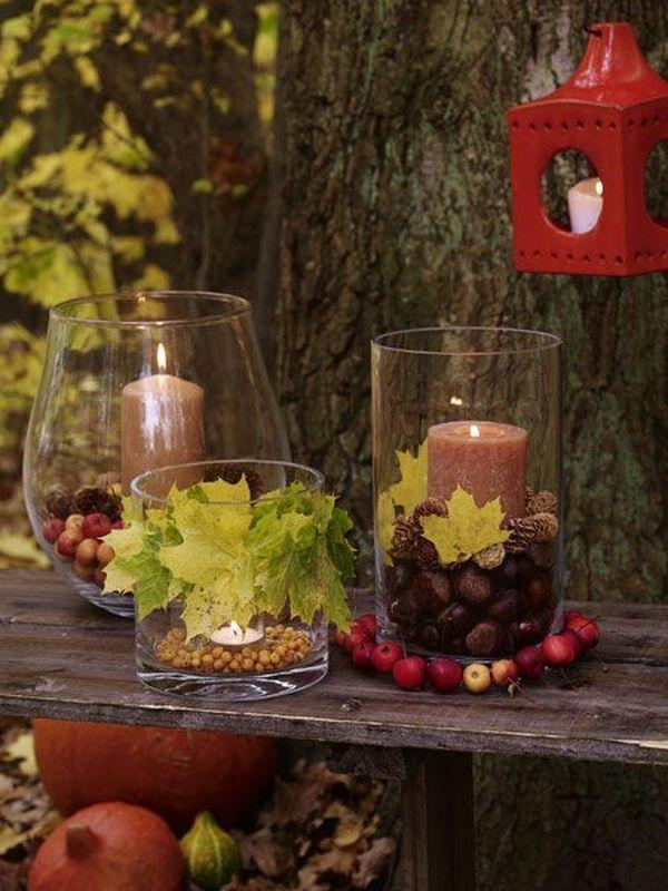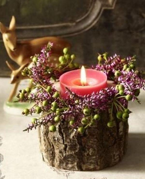Μπορούμε να φτιάξουμε όμορφες συνθέσεις με κεριά σε πιο ζεστά χρώματα, σε αποχρώσεις του κόκκινου, του πορτοκαλί και του καφέ και να αφήσουμε τη φαντασία μας ελεύθερη συνδυάζοντας υλικά από τη φύση.
