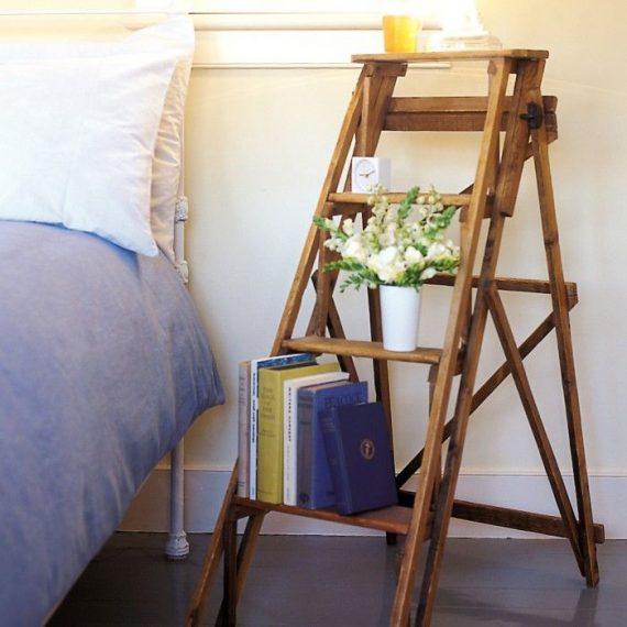 Στη συνέχεια, θα δούμε πώς μπορούμε να χρησιμοποιήσουμε μια σκάλα ως κομοδίνο. Είναι πραγματικά εύκολο. Όπως και στην περίπτωση της καρέκλας, χρειάζεται πρώτα να την προσαρμόσετε στο χώρο. Η προσαρμογή του νέου αντικειμένου εξαρτάται από τον τρόπο που θα το ταιριάξετε με την υπόλοιπη διακόσμηση του υπνοδωματίου.