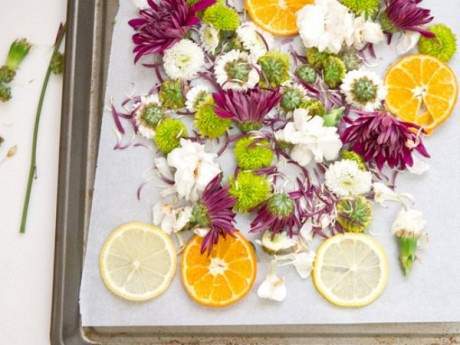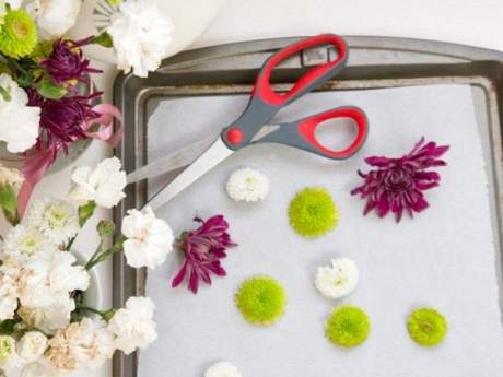 Καλύπτετε το δισκάκι με αντικολλητικό χαρτί φούρνου, κόβετε τα μπουμπούκια, ή μεμονωμένα πέταλα, και τα τοποθετείτε στο δισκάκι