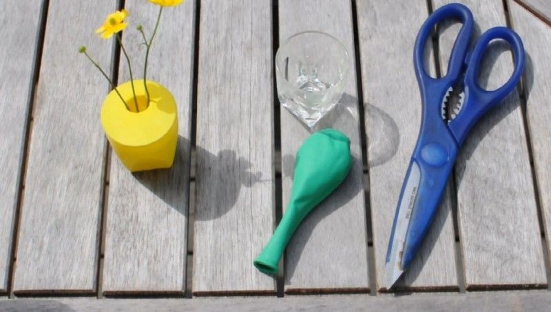 Αρχικά, βεβαιωθείτε ότι έχετε όλα όσα χρειάζεστε: ένα μικρό ποτήρι, ένα μπαλόνι και ένα ψαλίδι. Η αριστερή πλευρά της φωτογραφίας δείχνει ποιο είναι το τελικό αποτελέσμα του τεχνάσματός σας.