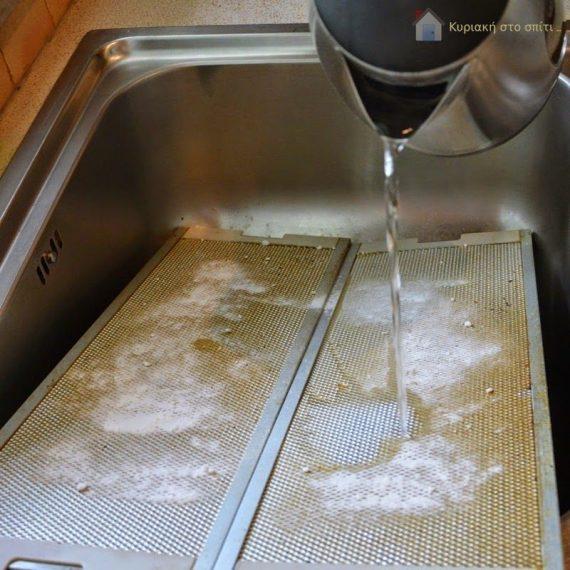 Έπειτα, λοιπόν, βυθίζεις το φίλτρο πρώτα από την μία πλευρά και έπειτα από την άλλη μέσα στην κατσαρόλα και αφήνεις την κάθε πλευρά για λίγα λεπτά όσο βράζει το νερό. Γρήγορα θα παρατηρήσεις ότι στην επιφάνεια του νερού θα ανεβαίνουν τα διαλυμένα λίπη. Αφού τελειώσεις και με τις δύο πλευρές, άφησέ τα να στεγνώσουν και τοποθέτησε τα στη θέση τους. Αν τα φίλτρα σου έχουν επίμονους λεκέδες και τα λίπη έχουν ξεραθεί, μπορείς να επαναλάβεις την διαδικασία.
