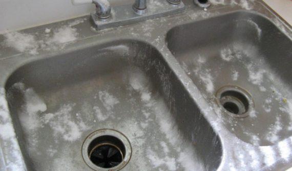 Για να καθαρίσετε τον inox νεροχύτη ψεκάστε τον ολόκληρο με ξύδι (που έχετε βάλει σε μπουκάλι με σπρέι). Από πάνω ρίξτε μαγειρική σόδα. Αφήστε το έτσι για 10 λεπτά. Παράλληλα βράστε νερό, με το οποίο θα ξεπλύνετε στη συνέχεια τον νεροχύτη.