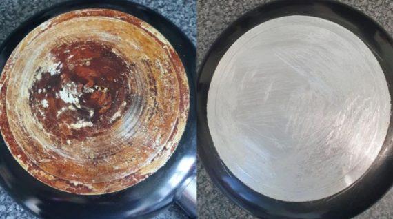 Καλύψτε τον πάτο του τηγανιού με νερό. Προσθέστε μία κούπα λευκό ξύδι. Βάλτε το τηγάνι στο μάτι της κουζίνας και ανάψτε το για να βράσει το νερό. Μόλις βράσει απομακρύνετε και προσθέστε 2 κουταλιές της σούπας μαγειρική σόδα. Αφήστε το μερικά λεπτά. Αδειάστε το διάλυμα και πλύνετε κανονικά με σφουγγάρι και απορρυπαντικό.