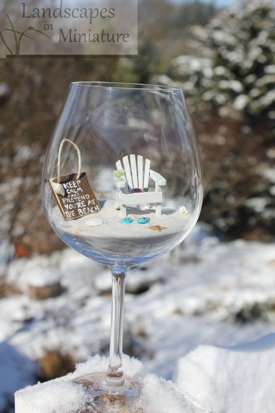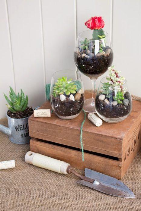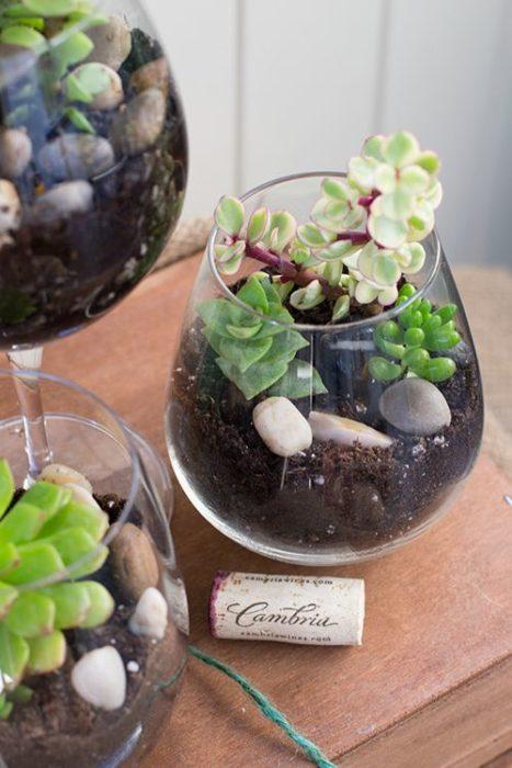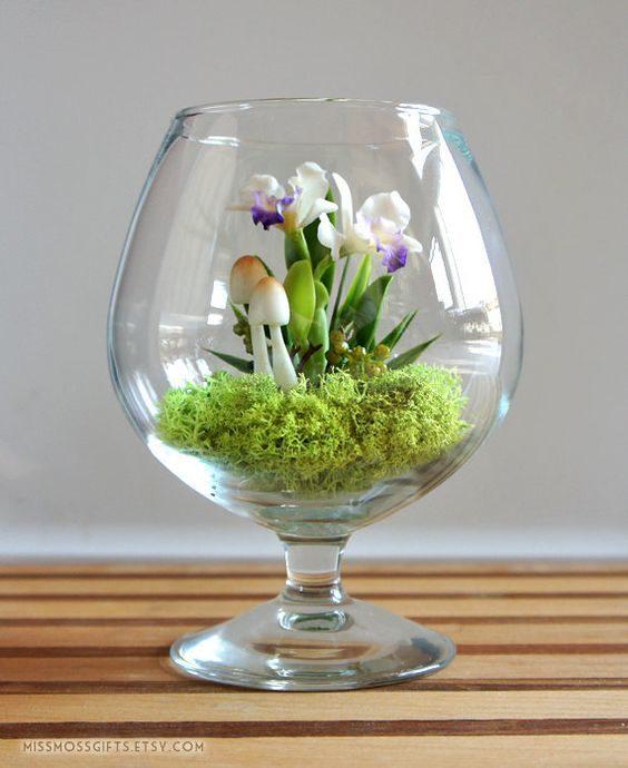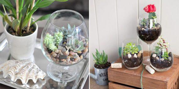 Αν σας αρέσουν οι νεραϊδένιοι κήποι, τότε αυτή είναι η ιδανική λύση. Αν επιλέξετε κάκτους ή παχύφυτα, τότε μπορείτε να βάλετε στο ποτήρι πέτρες για στιλ. Αυτή η σύνθεση δεν χρειάζεται ιδιαίτερη περιποίηση και είναι μια όμορφη ιδέα για δώρο.