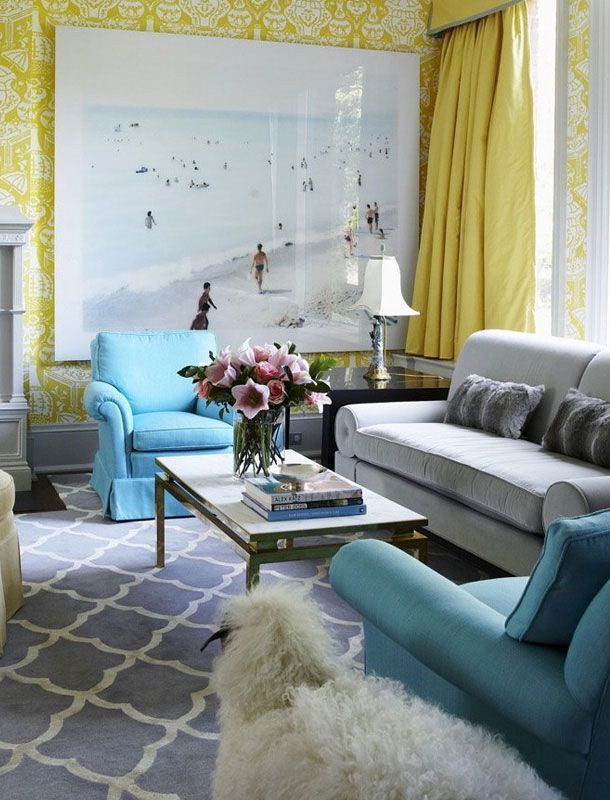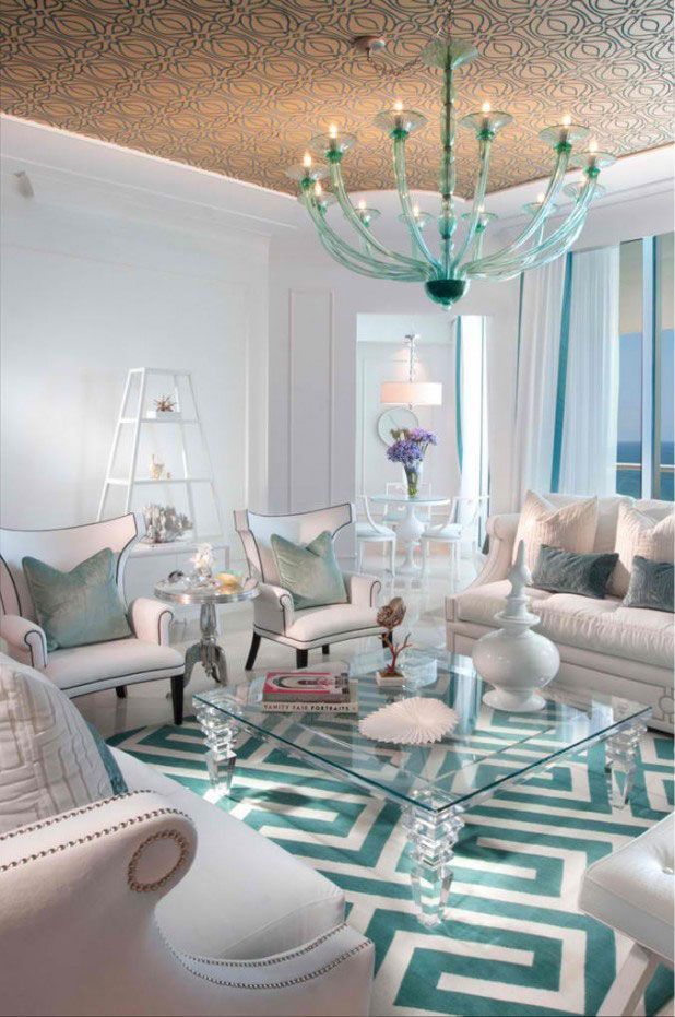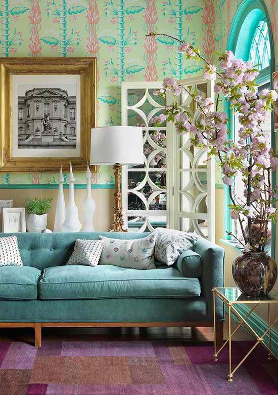 Δύο χαρακτηριστικοί τοίχοι, ο ένας λαμπερός φούξια και ο άλλος καλύπτεται από πετρόλ-χρυσή ταπετσαρία. Τα έπιπλα σε λευκό και μπλε δημιουργούν ένα δροσερό σαλόνι, ενώ το δάπεδο σε φυσικό χρώμα ξύλου καλύπτεται από ένα μπεζ χαλί.