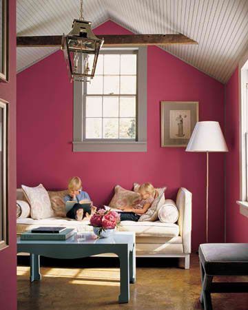 Οι ζωηροί ροζ τοίχοι και ένα ανάκλιντρο μετατρέπουν τον χώρο σε καταφύγιο. Τα έπιπλα και τα υφάσματα είναι σε κρεμ και απαλό γκρι.