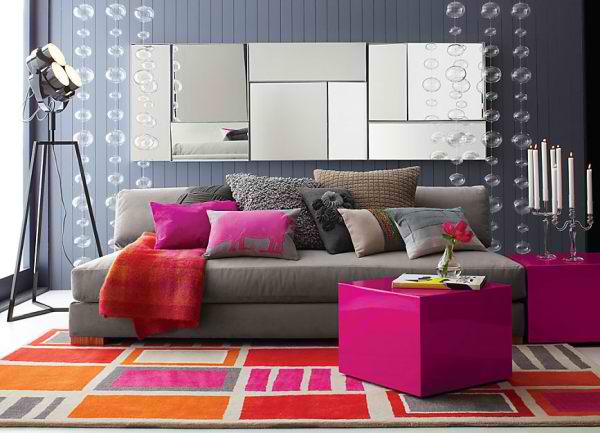 Η ροζ πλευρά του τραπεζιού δεν είναι ο μοναδικός πολύχρωμος τόνος σε αυτό το δωμάτιο. Το γκρι χρώμα του τοίχου και του καναπέ δημιουργούν ένα τέλειο σκηνικό, συμπεριλαμβανομένου του γεωμετρικού χαλιού και της κουβέρτας σε κοκκινο-πορτοκαλί αποχρώσεις.
