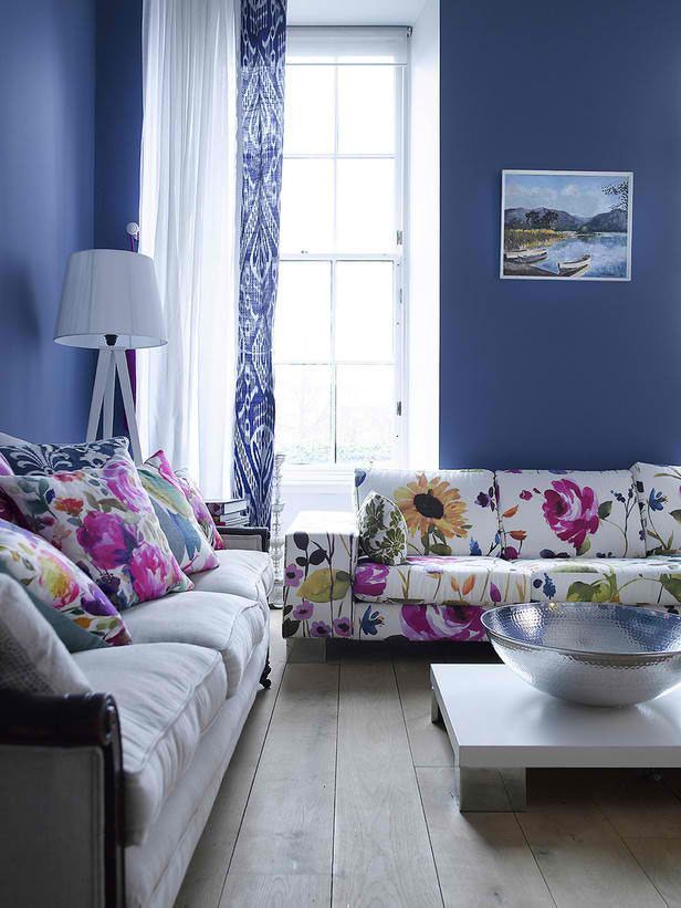 Blue Living Rooms. Ποιος είπε οτι τα χρώματα που θα επιλέξετε θα πρέπει να είναι πάντα φωτεινά; Αυτό το βαθύ μπλε σαλόνι παρέχει το τέλειο σκηνικό για έπιπλα με εντυπωσιακά floral prints. Η σχεδιάστρια Fiona Douglas απέφυγε την υπεραφθονία από συνηθισμένα πρότυπα, συνδύασε floral σχέδια με λευκές λεπτομέρειες και δημιουργησε την τέλεια ισορροπία χρωμάτων.