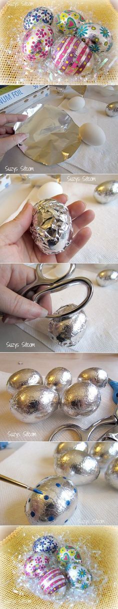 1.) Για να δημιουργήσετε αυτά τα εκπληκτικά αργά βράστε τα αυγά σας καλά, και στη συνέχεια αφού θα έχουν κρυώσει τυλίξτε τα με ένα αλουμινόχαρτο. Έπειτα, βάλτε φαντασία, πάρτε τα ακρυλλικά χρώματα και ζωγραφίστε οτι θέλετε πάνω σε αυτά.
