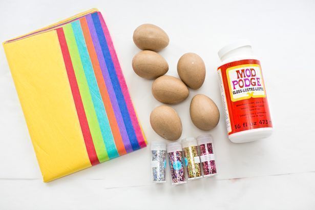 Βήμα δεύτερο: Στρώστε κάτω από την επιφάνεια που θα εργαστείτε μια εφημερίδα ή μια λαδόκολλα προκειμένου να μην λερώσετε το χώρο. Προσθέστε λίγη κόλλα Mod podge σε ένα μπολ μιας χρήσης. Βουτήξτε τα δάχτυλά σας στη κόλλα Mod podge και απλώστε τη πάνω στο πεπιεσμένο χαρτί και στο χαρτί περιτυλίγματος που θα βάλετε πάνω στα αυγά. Τα χέρια σας θα κολλάνε, οπότε όσο κάνετε αυτή τη διαδικασία θα χρειαστεί να τα πλύνετε αρκετές φορές.
