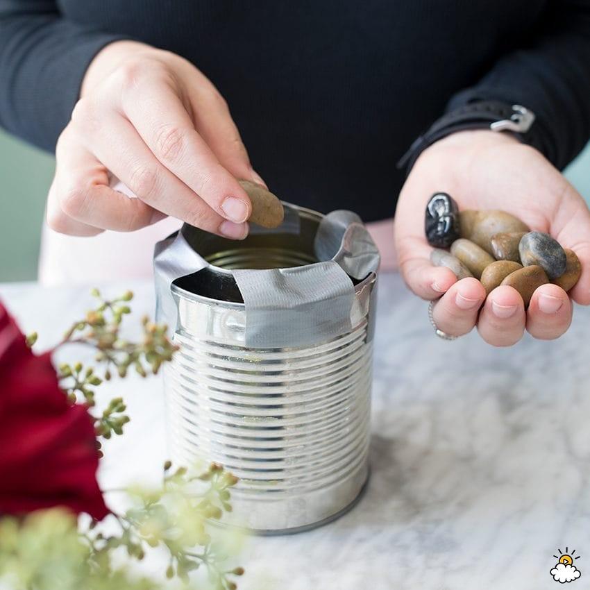 #2 Βάλτε πετρούλες μέσα στο μικρό κονσερβοκούτι ώστε να πάρει μια κλίση προς τα κάτω.. Οι πέτρες θα κρατήσουν το κονσερβοκούτι στη θέση του , όταν το νερό παγώσει..