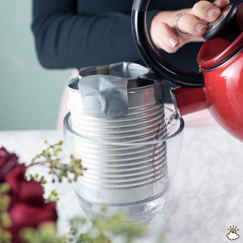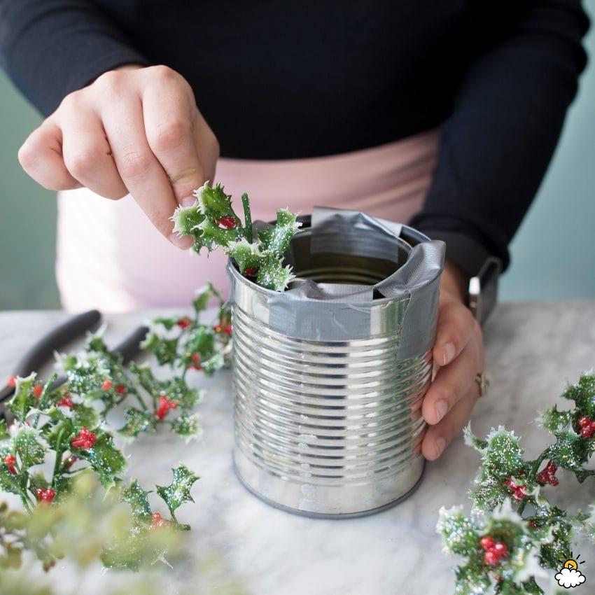 #4 Κολλήστε τη γιρλάντα στο κονσερβοκούτι. Τοποθετήστε στρατηγικά τα κομμάτια της γιρλάντας με το γκυ μέσα στο χώρο μεταξύ του μεγάλου και του μικρού δοχείου. Αφαιρέστε τα κομμάτια της ταινίας όσο βάζετε τη γιρλάντα ώστε το γκυ να μην κολλήσει μόνο σε μια περιοχή, και όταν τελειώσετε απλά βεβαιωθείτε ότι έχετε βάλει στη θέση της την ταινία.