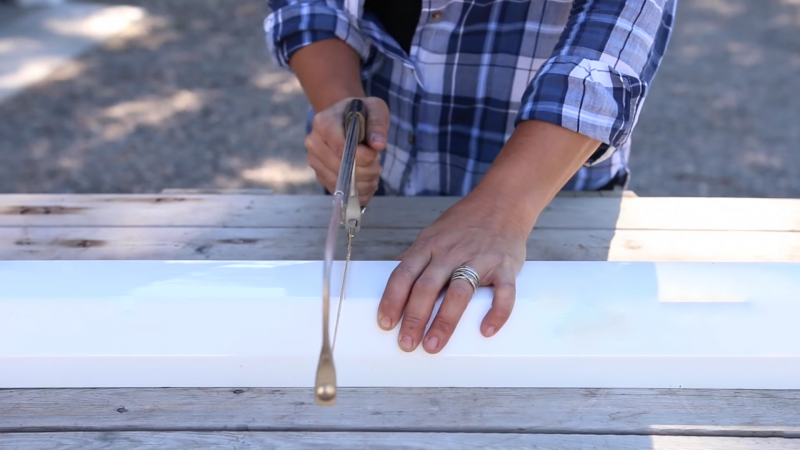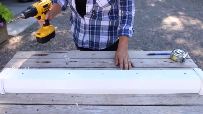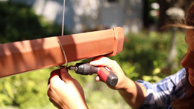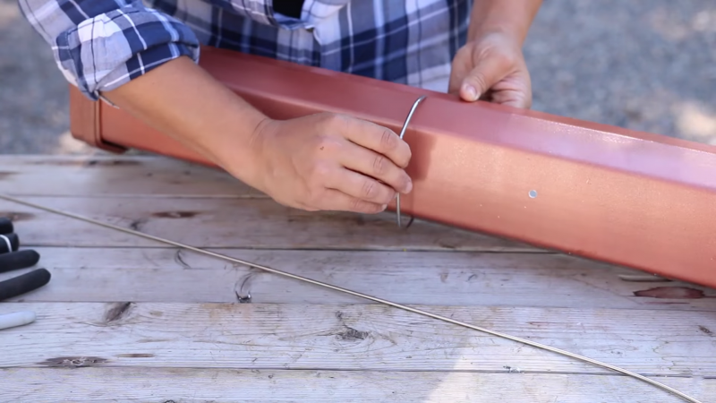 Κάντε τρύπες με ίση απόσταση μεταξύ τους στον πάτο των λουκιών χρησιμοποιώντας ένα τρυπάνι. Μπορούν να είναι και λίγο μεγαλύτερες από αυτές της φωτογραφίας. Από αυτές τις τρύπες θα περνά το νερό. Οι δύο εξωτερικές τρύπες πρέπει να έχουν ίση απόσταση από την άκρη ώστε να ισορροπούν τα λούκια. Το συρμάτινο καλώδιο θα περάσει μέσα από αυτές τις δύο τρύπες παρακάτω.