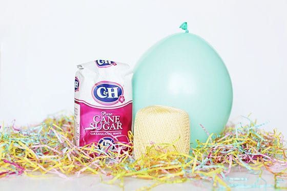 3 φλιτζάνια ζάχαρη 1 φλιτζάνι ζεστό νερό Περίπου 9 σταγόνες χρώματος τροφίμων για να φτιάξουμε παστέλ αποχρώσεις (προαιρετικά) ένα μεσαίο μεγέθους μπαλόνι 1 καρούλι νήματος για βελονάκι δαντέλα ή κορδέλα ακρυλικό σπρέι (προαιρετικό)